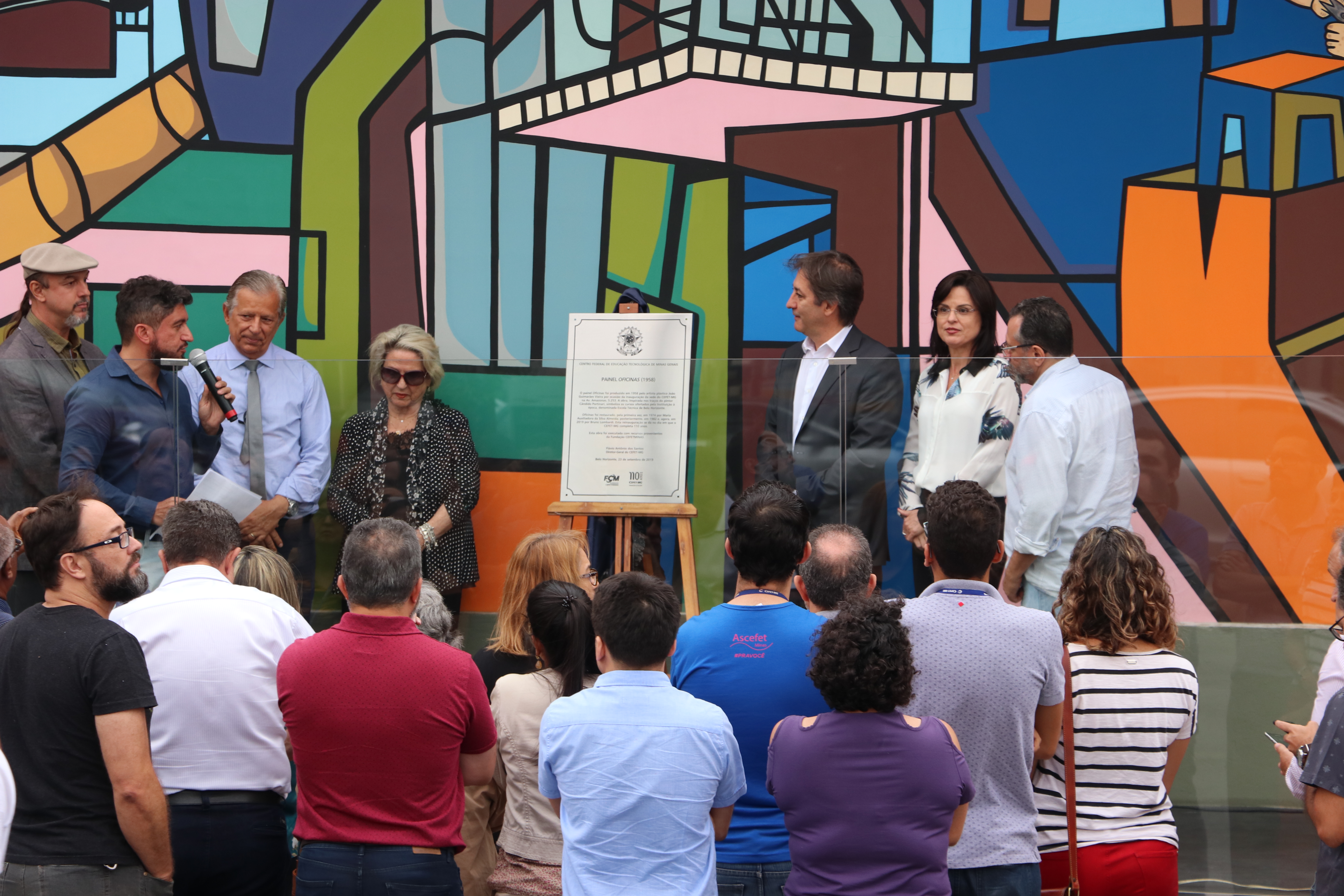 Reinaugurado, ontem dia 23/09, o painel “Oficinas” no CEFET-MG, campus I. A pintura, uma obra de arte dos anos de 1950, conta um pouco a história dos cursos oferecidos pela instituição na época de sua criação. As imagens representam as profissões ofertadas pela antiga Escola de Aprendizes e Artífices.